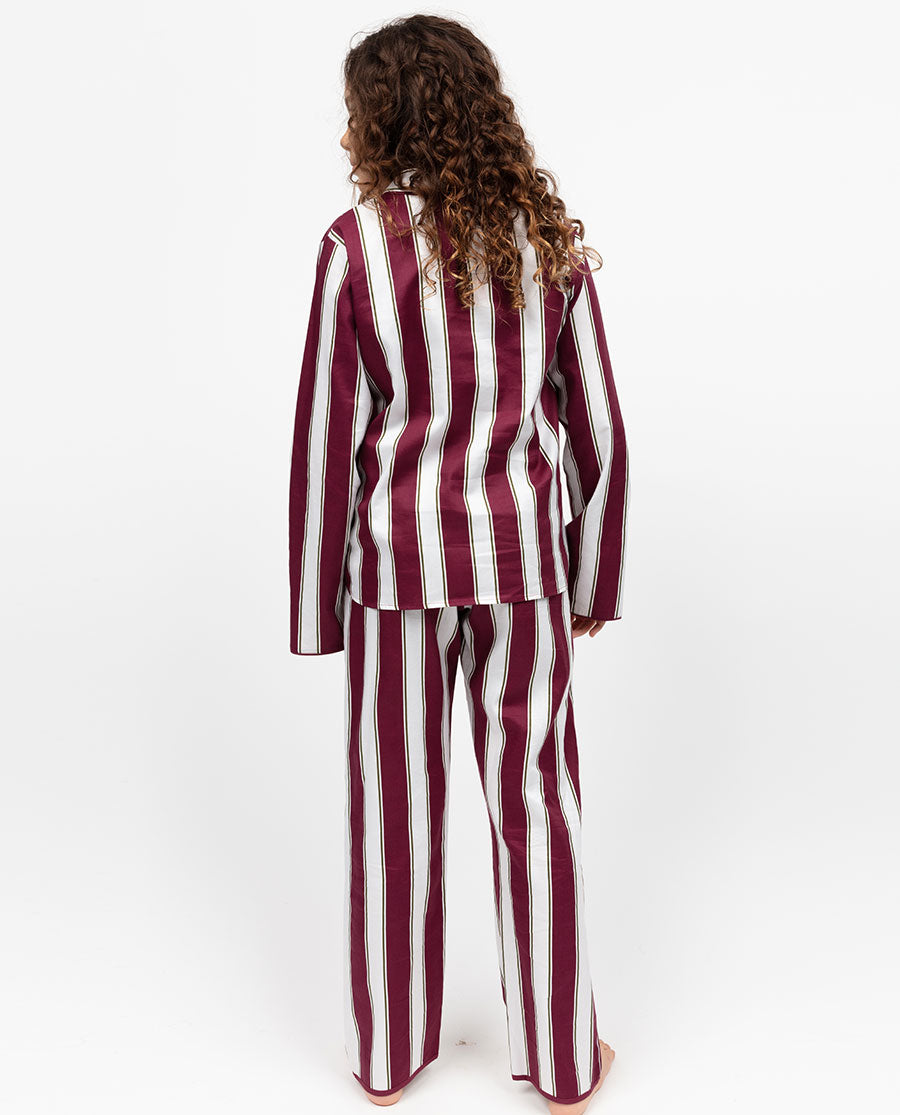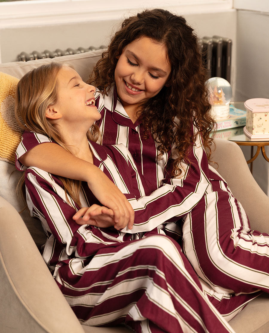 For evenings spent winding down and mornings where they can take it easy. Our Yasmin Girls Oxblood Mix Printed Stripe Long Sleeve Pyjama Set is made to bring a sense of ease to every part of your little one’s bedtime routine, from first putting them on to those final moments before they fall asleep. Made from a super-soft blend of 60% cotton and 40% modal, this set is breathable, lightweight, and kind to the skin perfect for staying comfy from the first yawn in the morning. The bold oxblood red and white stripe print adds a cheerful energy while contrast trims in oxblood modal offer a soft and thoughtful finish. The top features a revere collar, functional open placket and shaped hem for a classic pyjama look, while the elasticated waistband and adjustable drawstring on the bottoms offer a secure, flexible fit. Two slanted side pockets add a practical detail for small essentials that need keeping close. With matching women’s sizes available, twinning together makes for an even cosier kind of night in.