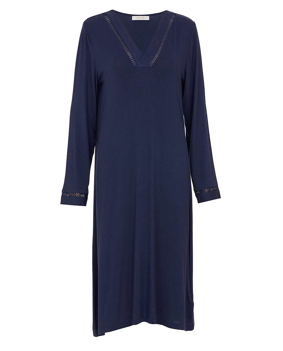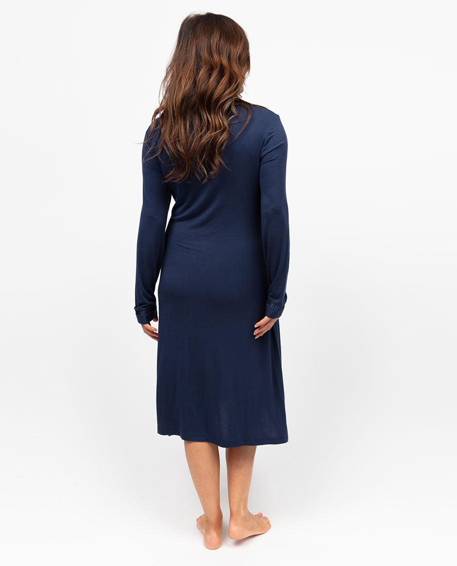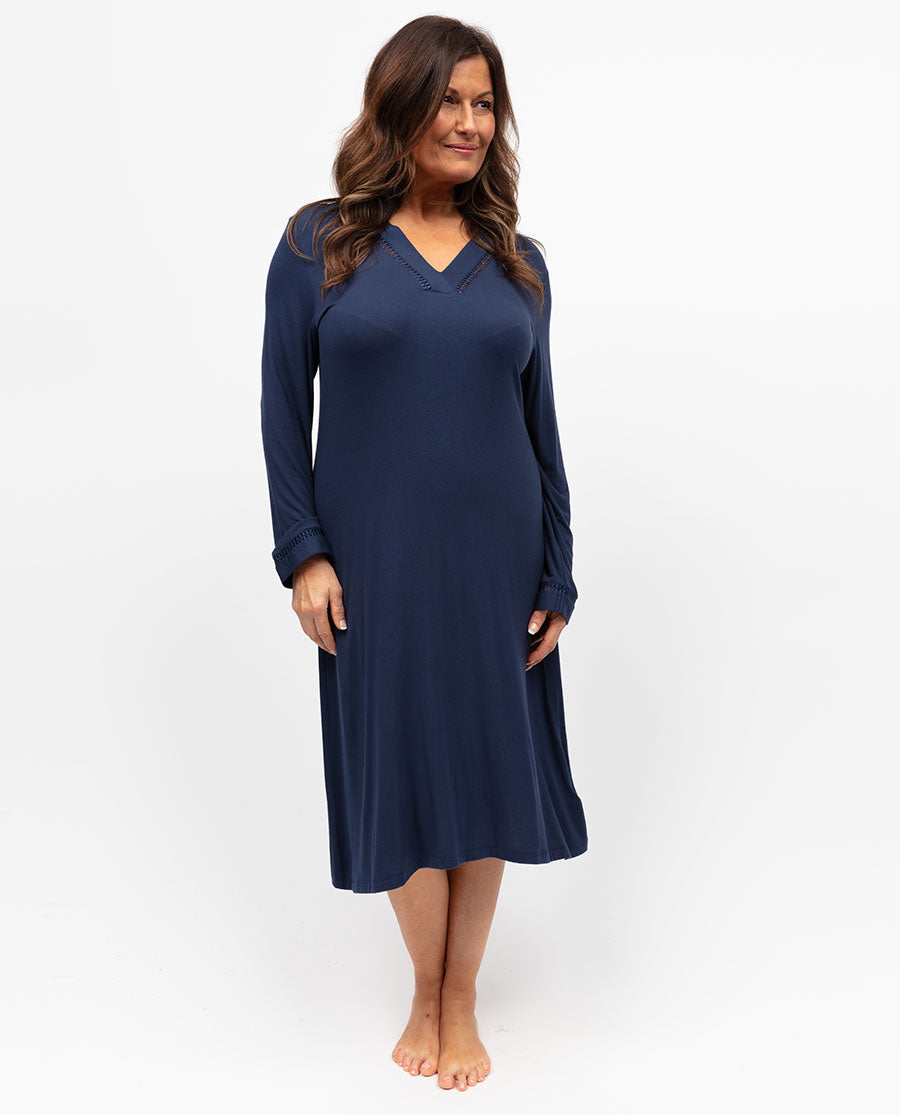 Your evening routine doesn't need to be reinvented, but it does deserve pieces that make it all the more comfy and easy to unwind. The Caroline Navy Insert Lace-Detail Jersey Long Sleeve Short Nightdress was designed for those wind-down moments that need softness. Made from a jersey blend of 95% modal and 5% elastane, it offers gentle stretch and ease. The neckline is shaped and trimmed with fine geometric lace, with subtle pleats that bring just enough depth to the front. Long sleeves provide a sense of calm coverage, and the above-knee length keeps the silhouette light, relaxed, and easy to move in. Finished with clean self-fabric edges and dyed in a grounding navy blue, this nightdress quietly does its job making evenings feel less rushed and mornings feel less harsh.