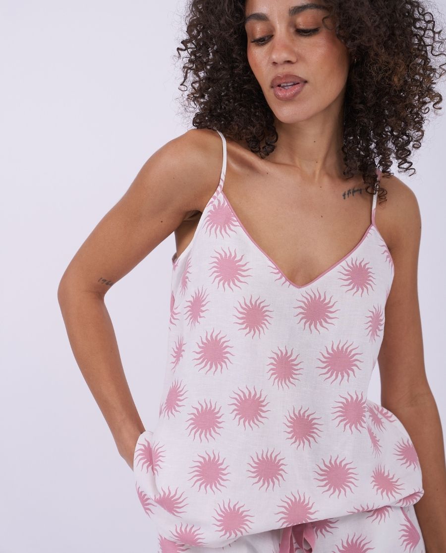 Sink into your evening with this lightweight women's PJ set with shorts. Featuring a print of roaring pink suns against a crisp white base, this short pyjama set for ladies is made from 51% linen and 49% viscose for a flowy and free-wheeling feel that’s perfect for hours of rest. The cami top has a V-shaped neckline, adjustable spaghetti straps, and is trimmed with a pink piping. The matching pyjama shorts come with an elasticated waistband and a modal tie to let you lounge in comfort with a little extra polish.
