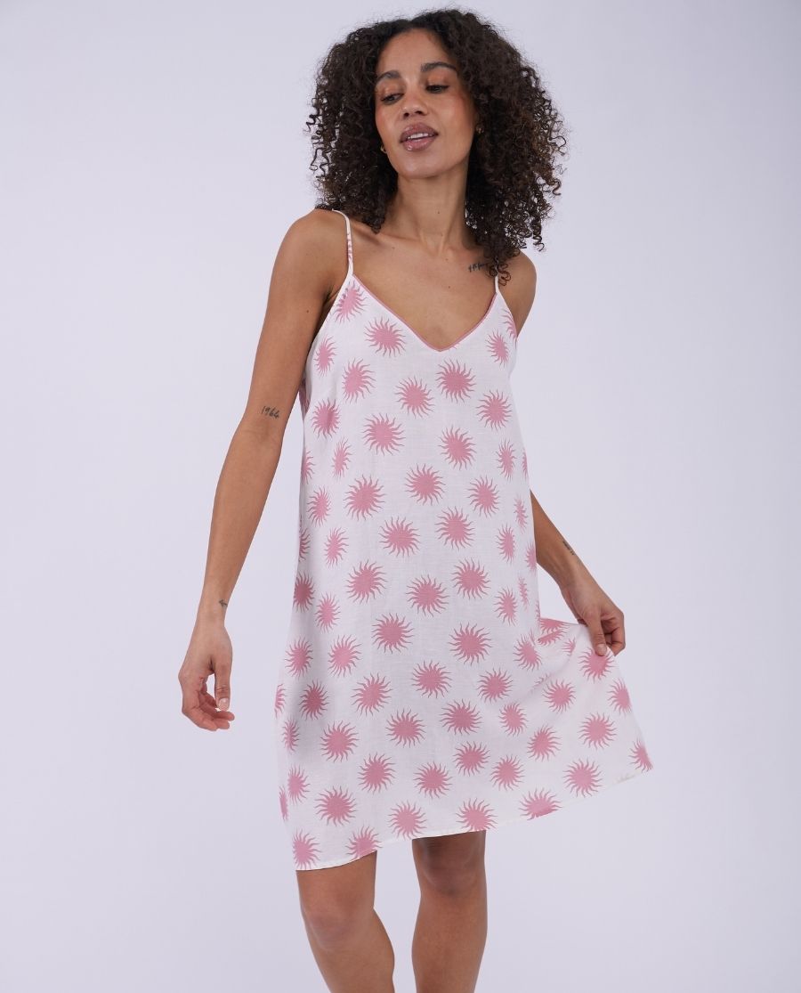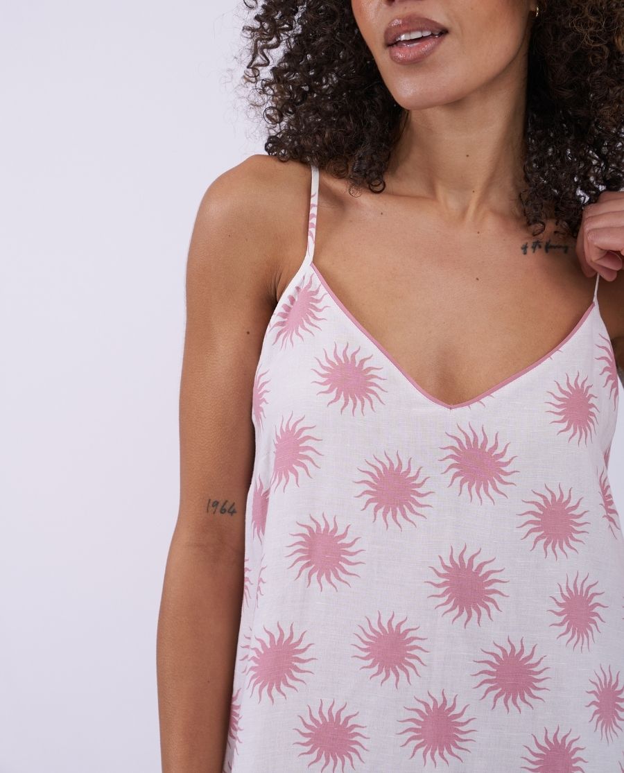Summer styling for staying in, this women’s nightdress features a print of pink suns blazing against a crisp white background, for a light feel during summer’s warmer evenings. Made from a blend of 51% linen and 49% viscose, this strappy nightdress has a V-shaped neckline, and a flattering, comfortable fit to make hours of rest easy. Made for sun-dappled lounging, it’s sure to be a favourite all year round.