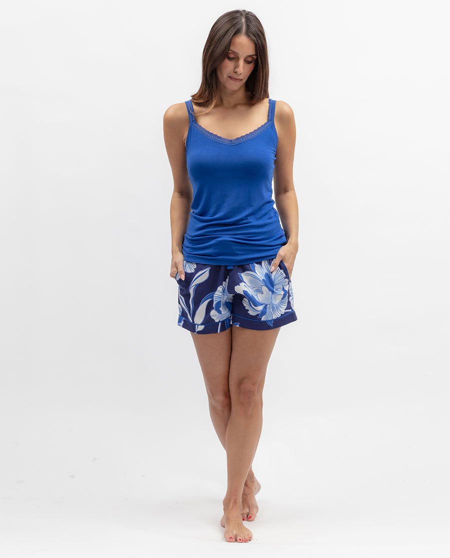 This set features navy floral print shorts adorned with a botanical pattern in white and blue, paired with a matching dark blue vest that includes built-in support. The shorts are crafted from a 60% cotton and 40% modal blend that feels soft and lightweight against the skin, with an elasticated back waist and adjustable front drawstring for a fit you can control. Cuffed hems to keep the leg opening structured, and two side pockets give you somewhere to slip your hands.