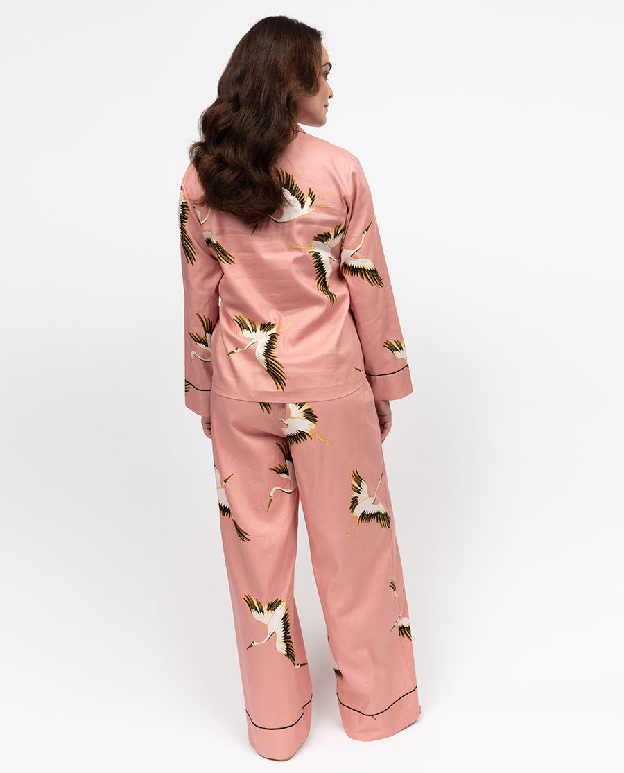 Bonnie Womens Pink Crane Bird Print Wide Leg Pyjama Set