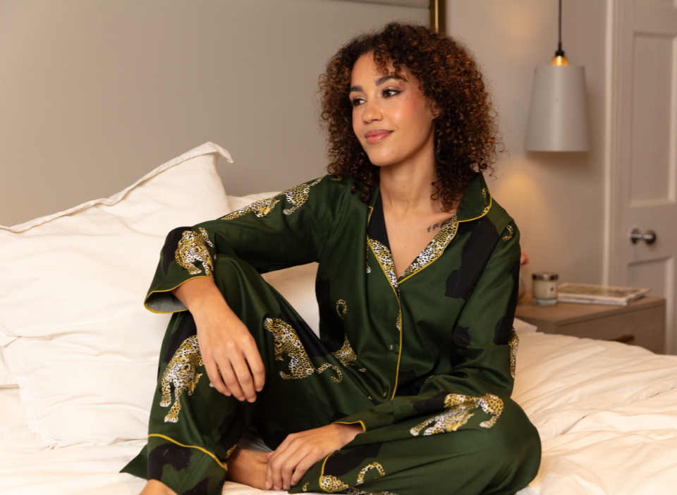 Olive Womens Leopard Print Wide Leg Pyjama Set Olive Womens Leopard Print Wide Leg Pyjama Set