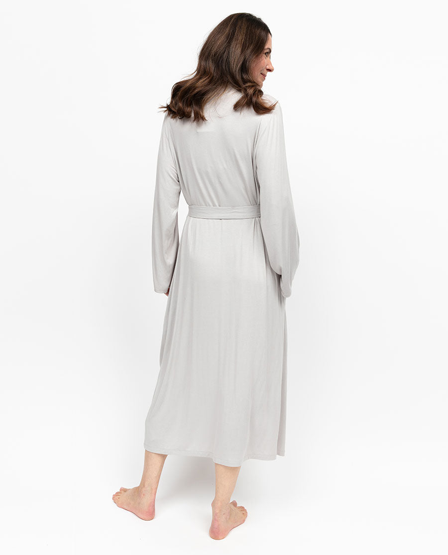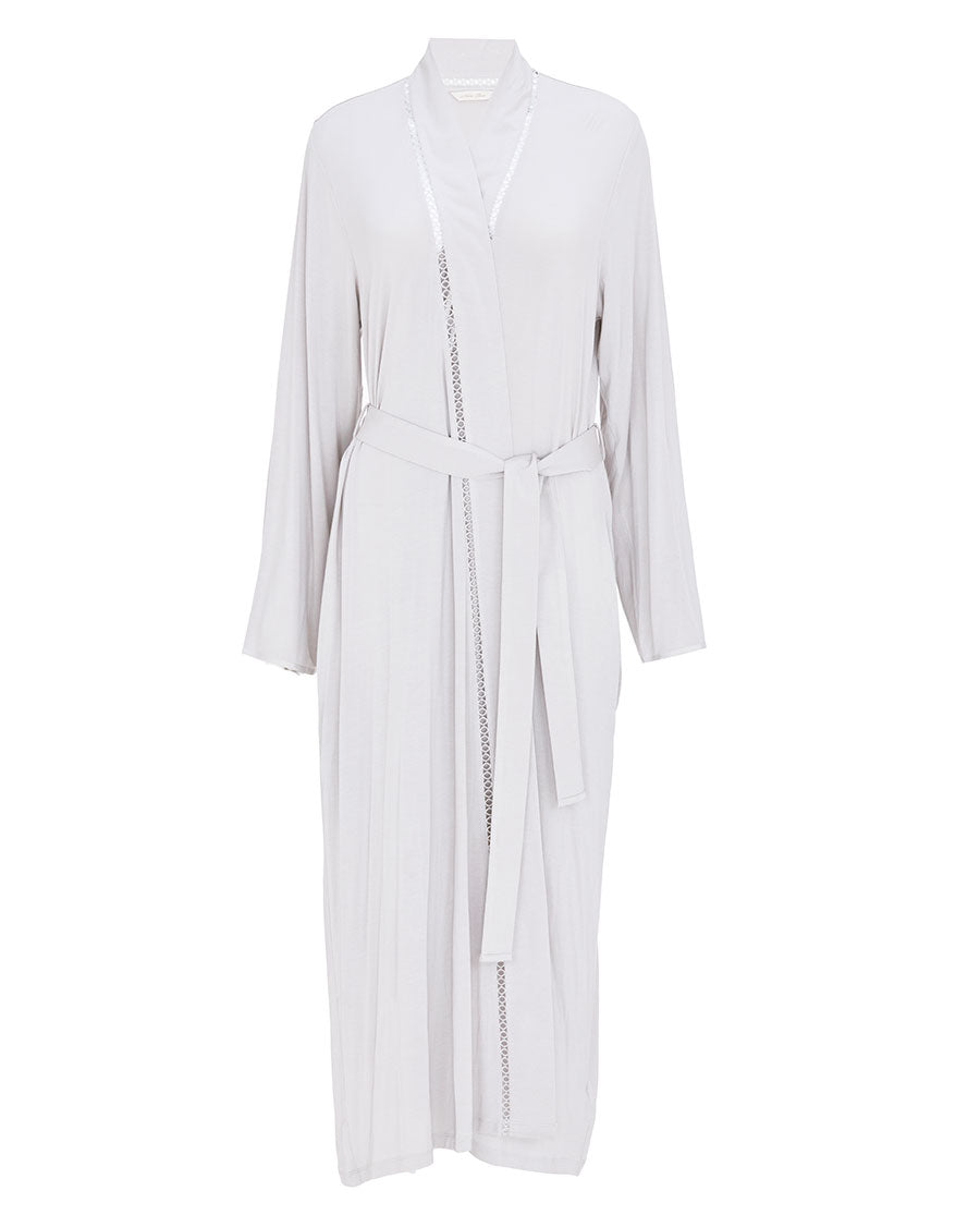 Complete the picture of downtime done properly with a dressing gown that makes every fleeting moment of calm feel like it belongs entirely to you. And our Willow Jersey Dressing Gown is the final layer for transforming your after-hours hours into something worth savoring.Crafted from our signature 95% modal and 5% elastane blend, this kimono-style gown has that coveted combination of a cloud-like body feel and enough weight to drape effortlessly. Grey modal piping traces the sleeves and wrap front in a clean line, while delicate insert lace runs along the entire collar - added texture to both soften and make this piece extra indulgent.Satin ties and a self fabric belt at the waist let you pull the gown tight or leave it loose, while two generous side pockets are a comfy addition to give your hands a home. The long, sweeping silhouette traces the floor and makes even the most mundane of moments feel like it was spent intentionally.Make your sleep-ready wardrobe feel as considered as your street-ready one. Soft, beautifully-made, and impossible to ignore even if you're the only one home.