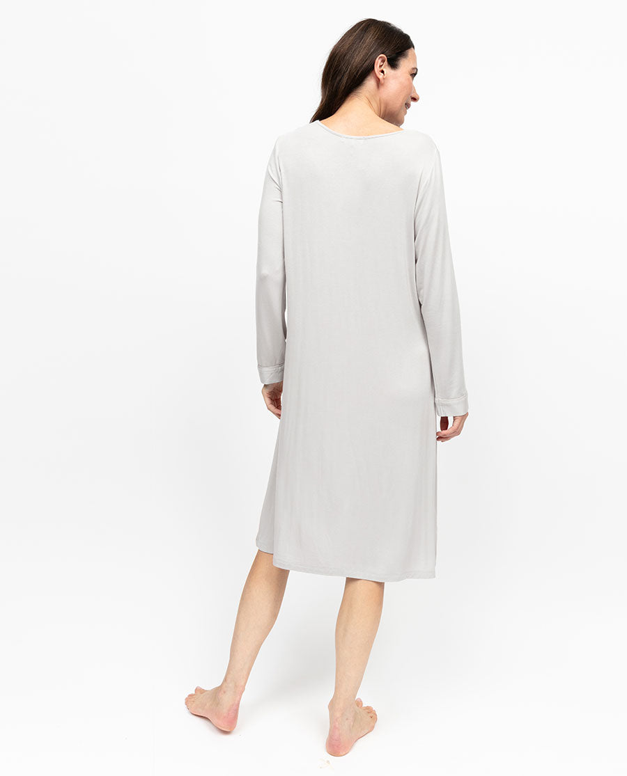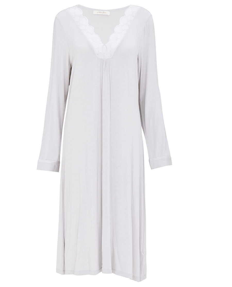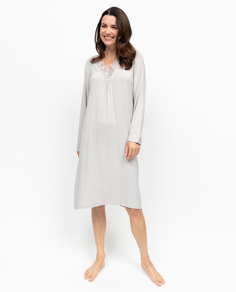 Give your downtime wardrobe what it's been missing - a nightdress that knows the importance of the slower hours and is sculpted to make them even comfier. Our Willow Lace-Detail Long Sleeve Nightdress is for those who believe that what you wear to bed should make you feel just as good as what you wear out of it.Cut from our signature 95% modal and 5% elastane blend, this nightdress delivers a cloud-like softness on the skin, has enough weight for a beautifully-falling drape, and is stretch infused to prevent any clinging as you unwind at your pace. With added textures coming out to play in the form of scalloped lace, grey modal piping along the neckline, and a pleated front, this nightdress is indulgent, intricate, and effortlessly flattering. With long sleeves to wrap you in gentle coverage, a V-neck front that's equal parts flattering and freeing, and a longer, drapier silhouette, this nightdress gives you all the room to lounge freely