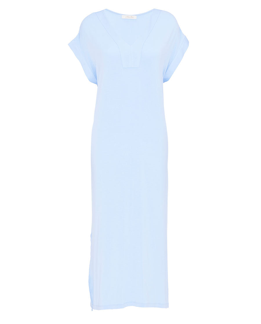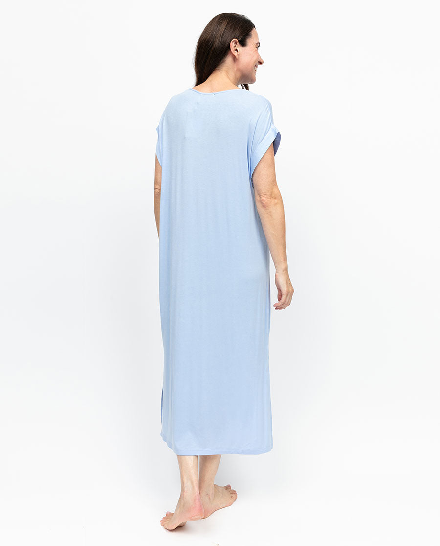 Brought to life from top to bottom in a cool blue hue, it lets the cut and fit do the talking. With short, cap sleeves creating a clean shoulder line, a V-shaped front neckline framing the face, and a modal finish to soften both further, this nightdress has a neat and tidy fit starting from the shoulders.
