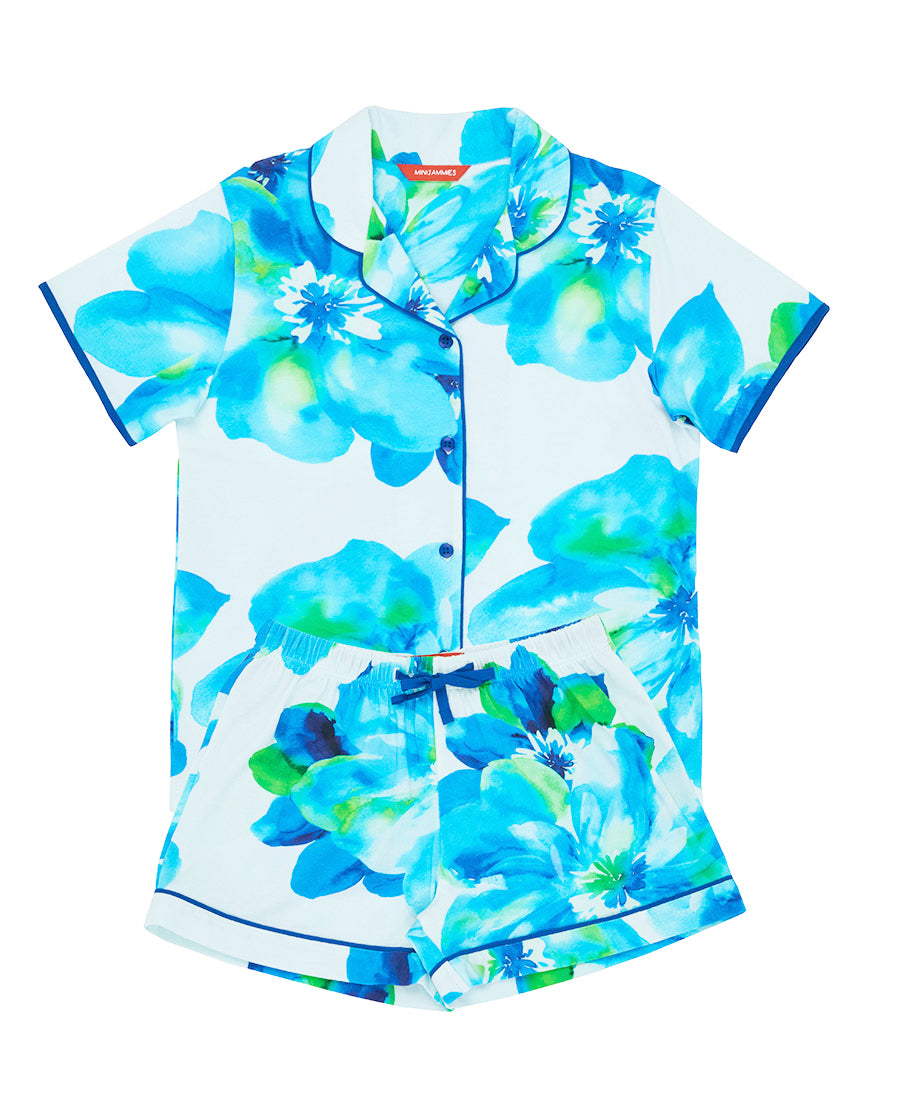 Printed with a scene of soft blue and green florals scattered against a crisp white base, this matching short sleeve and shorts set captures the feeling of long, bright days spent outdoors. The short-sleeved top features a soft-but-structured revere collar and dark blue to keep things neat and tidy, while the coordinating shorts are fully elasticated at the waist, with an adjustable drawstring, two slanted side pockets, and a gently relaxed fit for comfort that lasts all night. Both the top and shorts feature a dark blue modal trim to soften the seams and make the set extra indulgent.