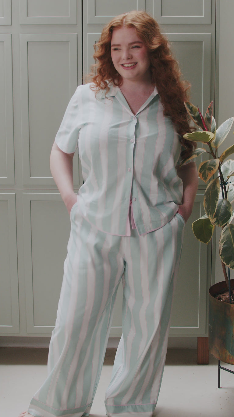 Cut from a smooth-yet-breathable blend of 60% cotton and 40% modal, this short sleeve top and wide leg bottoms set has that barely-there softness that means feeling comfy is a task made effortless. The fabric is printed with mint blue, white, and light pink stripes - a pattern that feels both playful and calm.