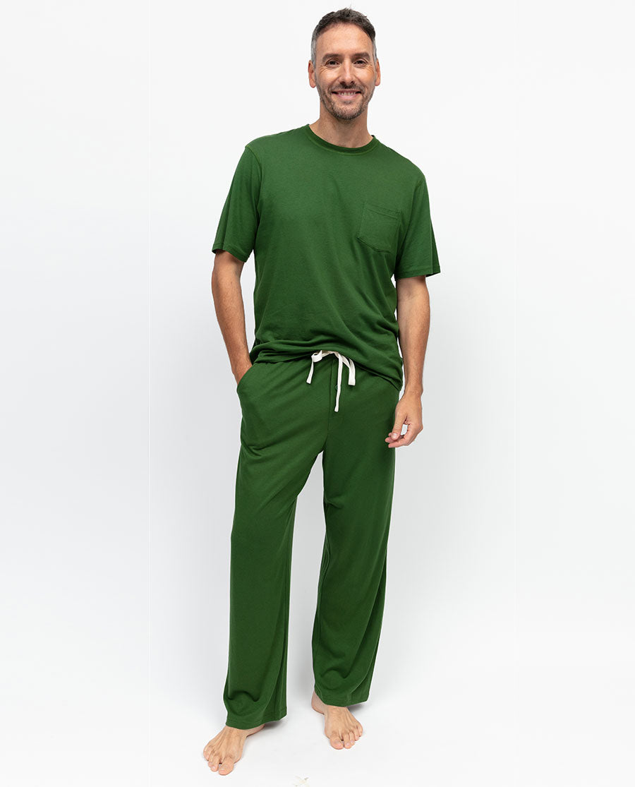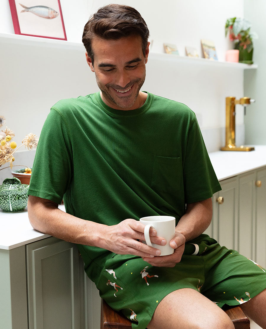 Finished with a round neckline, short sleeves, and a single shaped chest pocket, it’s a practical, built-for-sleep choice for unwinding in style.