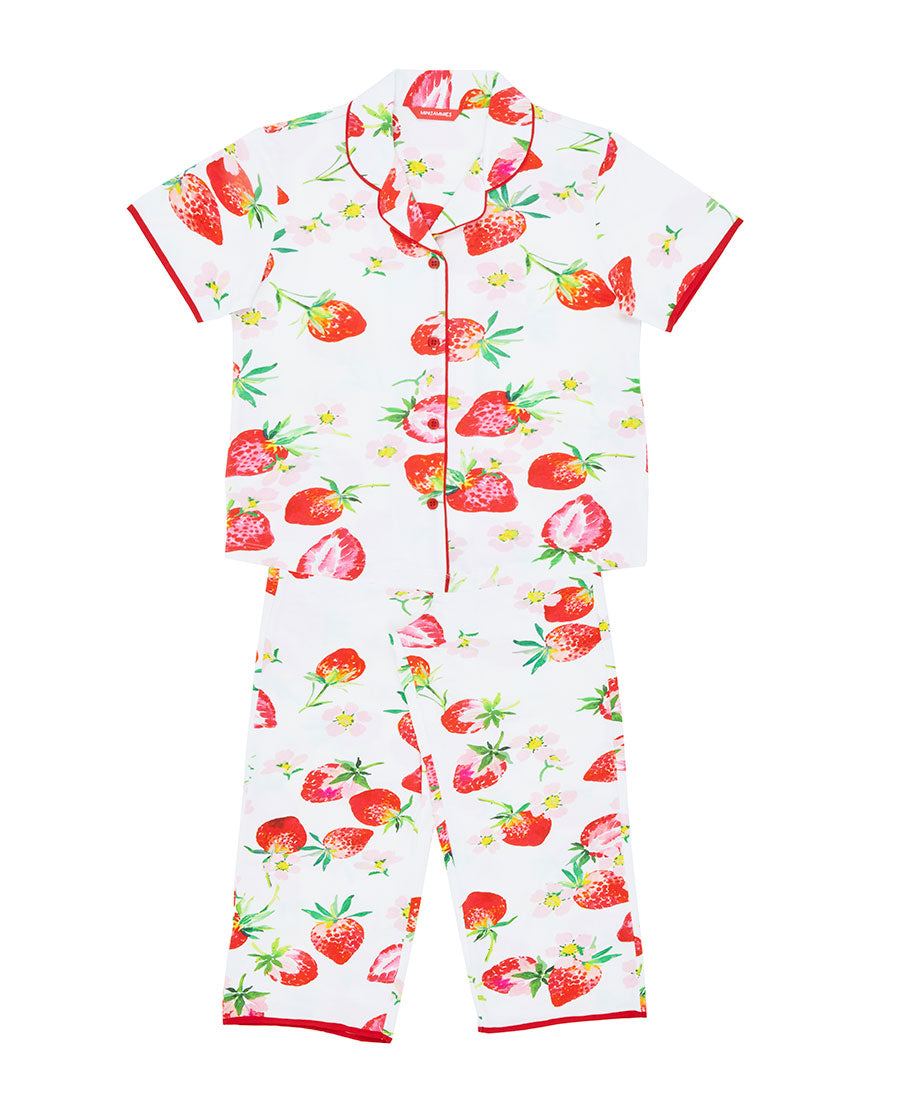 Scattered with a scene of ripe red strawberries and soft pink flowers blooming across a crisp white base, this vibrant and lively set is trimmed with a rich red modal piping to tie everything together.