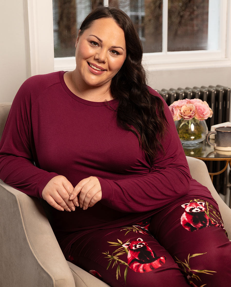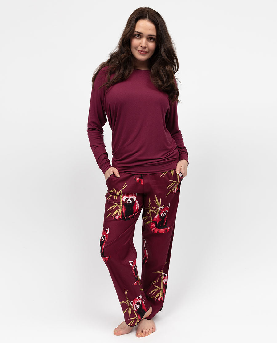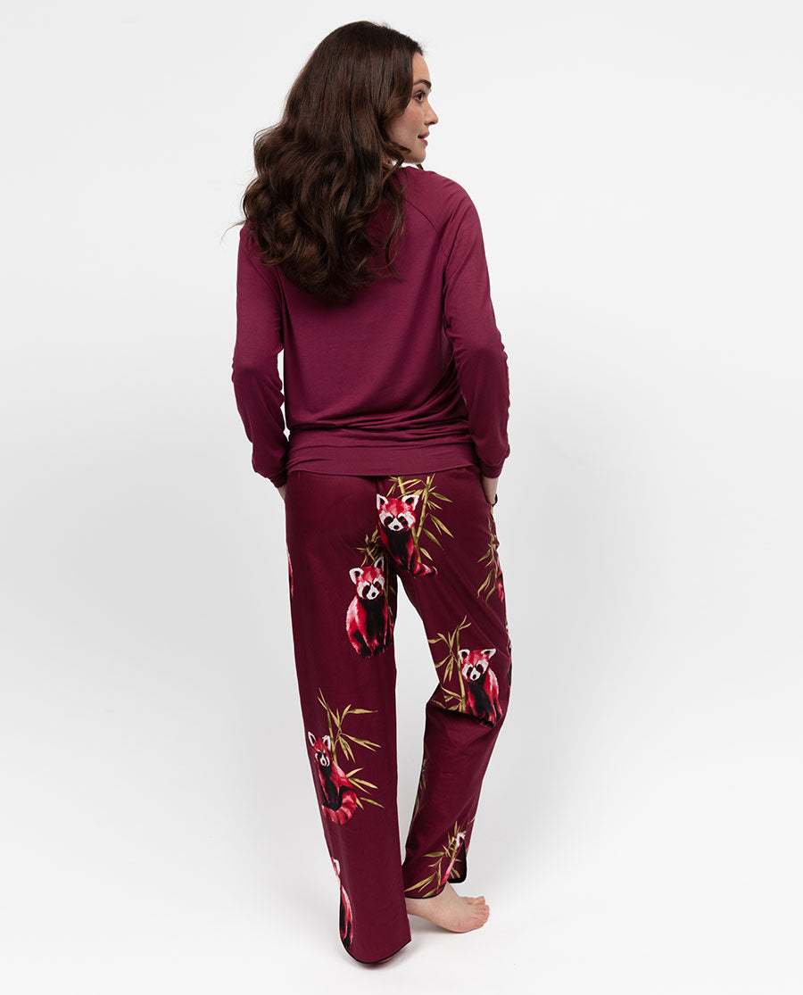When the day is done and there's nothing left on your list, this pyjama set is your cue to take things slowly. Cosy, coordinated, and full of quiet personality, this pyjama set combines a slouchy long sleeve top with relaxed wide-leg bottoms - a gentle invitation to slow down. The slouchy top is made from a stretch jersey blend in deep oxblood, designed with a round neckline and cuffed sleeves for the kind of casual comfort you'll live in come evening. The bottoms are cut in lightweight cotton-modal and printed with red pandas and bamboo shoots - a quiet, playful pattern that encourages you to let go and unwind. An elasticated back waist, drawstring front, and two easy pockets add just the right touches of practicality to an otherwise purely feel-good piece. Both pieces are available for individual purchase, letting you mix and match styles and sizes to your needs. So, you can wear the set together or mix and match with the rest of your favourites. This is nightwear that lets you rest easy, for those slow moments.