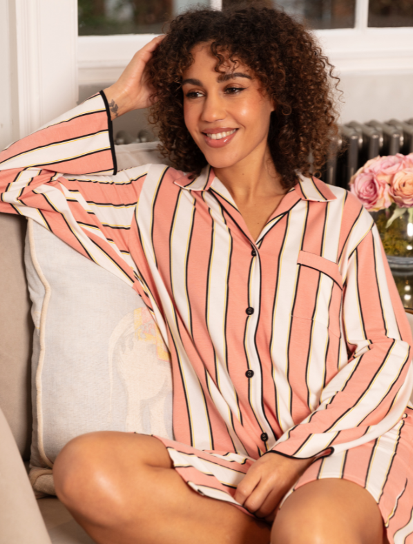 For ultimate ease, the Bonnie Pink Mix Stripe Nightshirt wraps comfort and charm into one flowing silhouette. With a button-up front and soft stretch jersey fabric, it’s perfect for those who want a touch of structure with their softness. Available in our extended sizes (6 to 28), because everyone deserves sleepwear that fits and flatters.