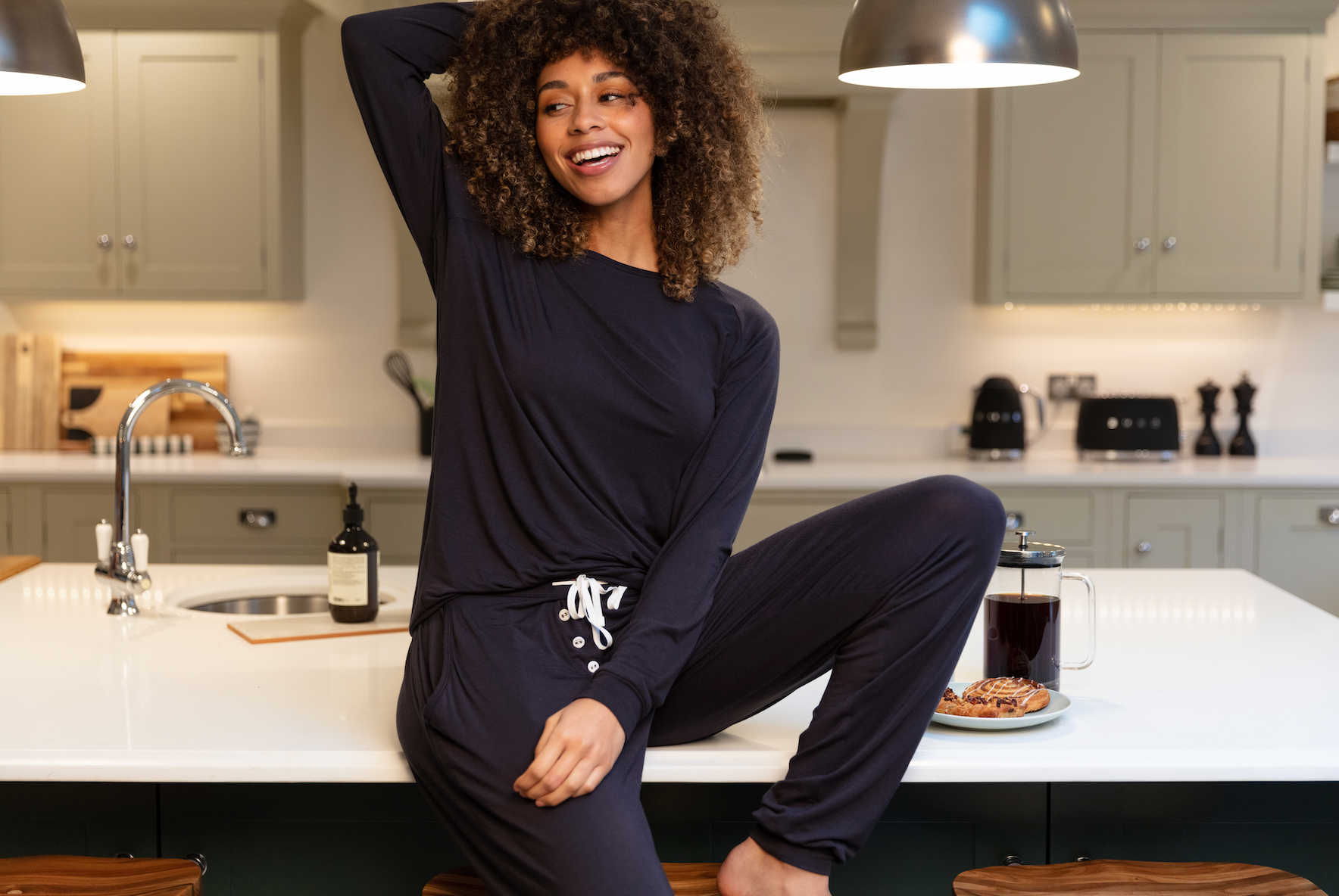 - Choisissez des vêtements de nuit qui peuvent faire office de vêtements de jour. L'ensemble de pyjama en jersey ample bleu marine Cyberjammies est conçu pour un confort et un style ultimes à porter de jour comme de nuit, faisant du petit-déjeuner en pyjama une évidence. Fabriqué à partir d'un tissu magnifiquement doux à 95 % de modal et 5 % d'élasthanne, notre exquis ensemble de pyjama ample en jersey bleu marine riche promet une sensation réconfortante semblable à une couette contre votre peau, tandis que le modal élégamment moutarde ajoute une touche de sophistication à son attrait charmant. Offrez-vous le luxe d'un petit-déjeuner en pyjama sans que personne ne le sache.