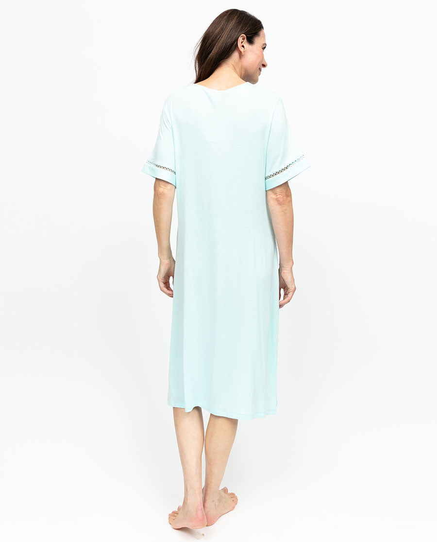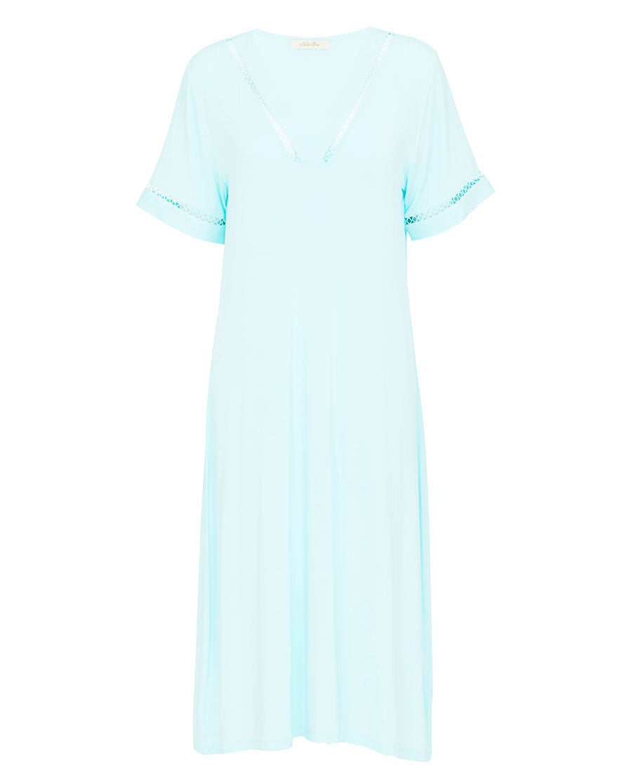 Crafted from our ultra-smooth 95% modal, 5% elastane blend, this short-sleeved nightdress delivers that skin-loving, stretch-kissed comfort that makes getting changed for your downtime a ritual worth looking forward to. We’ve made sure to make this one special, with our most-loved details on full display - a mint blue modal piping framing the V-shaped neckline and circular lace inserts along the neckline and sleeves add a delicate lift in texture.