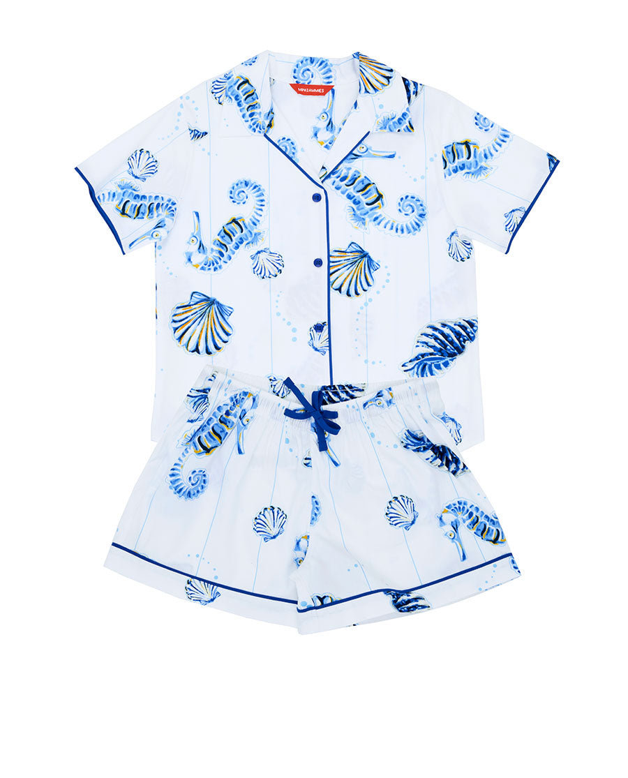 A seaside daydream, shrunk down for little loungers. Our Essie Girls Sea Horse Stripe Shorty Set brings the magic of sunlit shores to their sleepiest hours. Painted in ocean blues and dotted with drifting seahorses and seashells across crisp white and blue pinstripes, this set captures a slice of the seaside.