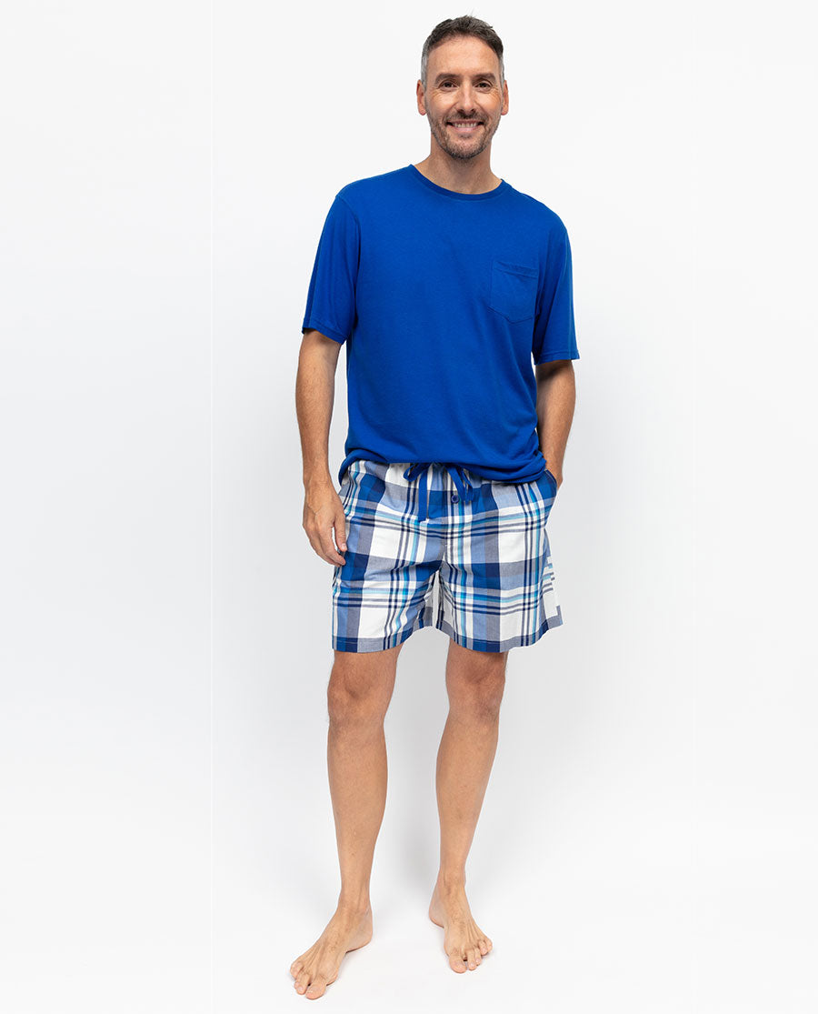 Paired with the fully brushed 100% cotton shorts, this set has all the cosy familiarity of flannel with a lightweight, breathable drape. The blue-and-white check print adds a timeless sense of charm, while the elasticated back waistband, adjustable front tie, and deep side pockets make these shorts practical as well as indulgent.
