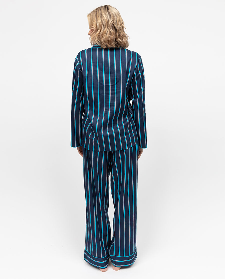 Because sometimes the best outfit of the day is the one that you wear to bed. Our Marina Womens Navy Mix Printed Stripe Long Sleeve Wide Leg Pyjama Set is the perfect combination of comfort and understated style for those days where bed sounds like the best place to be. Made from a soft cotton-modal blend, this set is designed to feel just as good on the body as you look wearing it. The navy base with bright blue pinstripes adds a classic design style to this otherwise modern pyjama set, and the aqua blue trim, revere collar and functional modal-covered buttons gives the top a fresh, polished finish. The long sleeves and shaped bottom hem of the top create a relaxed silhouette. And the matching pyjama bottoms are equally thoughtful with an elasticated back waist and adjustable front drawstring for a custom fit. The straight side pockets are perfect for tucking away small essentials, and the wide leg and cuffed hem give them a relaxed, easy drape. Whether you're curling up with a book or hitting snooze for the third time, this set makes comfort feel effortless while ensuring you look pulled together even if there's no one there to see. Each piece is available for individual purchase, letting you mix and match styles and sizes with ease.